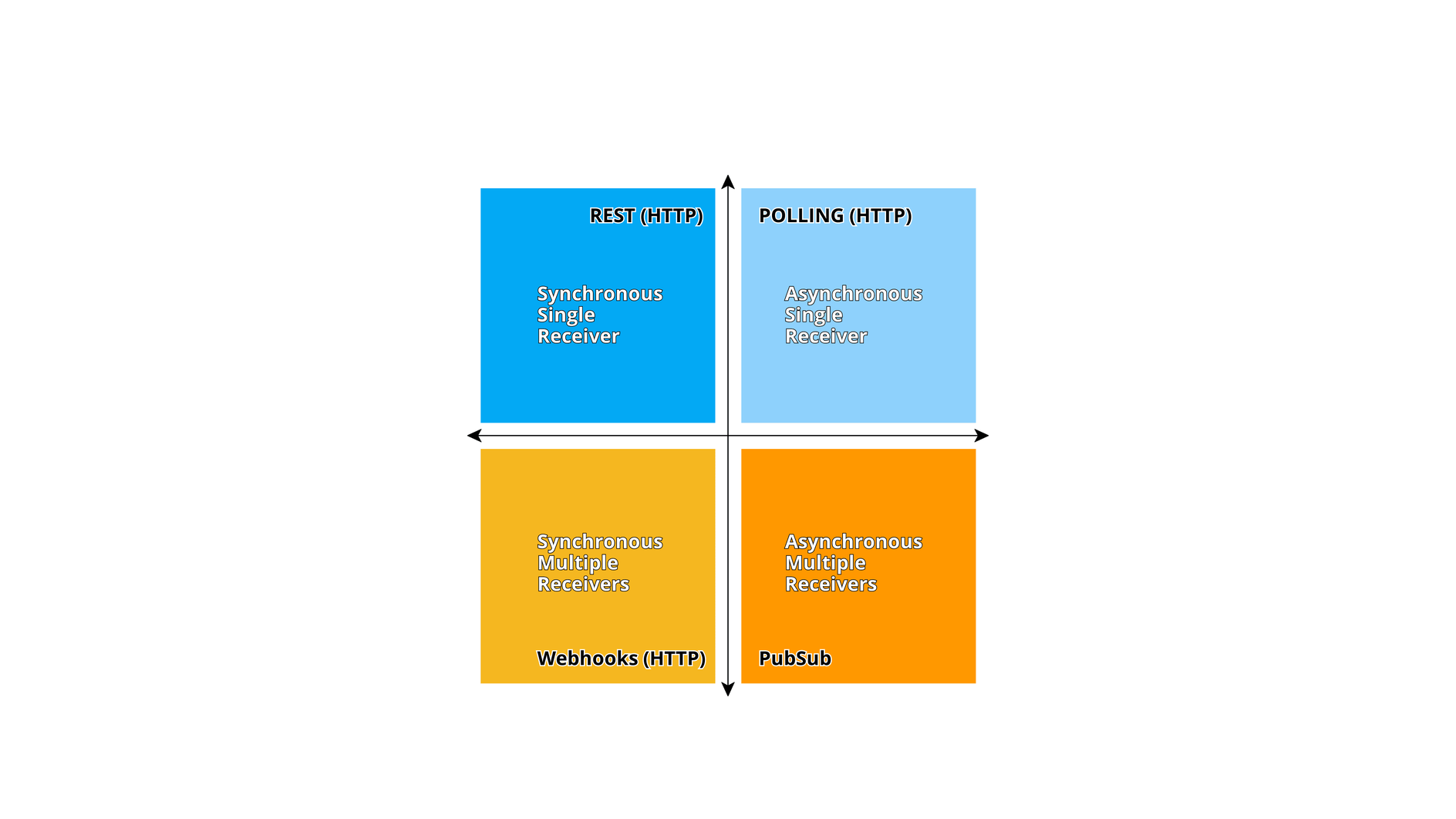We can classify the available communication types along two axis. The first defines synchronous verses asynchronous. The second axis defines the number of receivers or clients of the message. The below diagram gives us a quick overview of what available communication types and when they should be used.